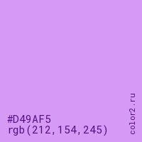 Цвет #D49AF5 в цветовой модели RGB обозначается тремя октетами (212, 154, 245) в десятичном формате и #D49AF5 в шестнадцатиричном (hex) формате, которые являются интенсивностью красного 212 (hex D4), интенсивность зелёного 154 (hex 9A) и интенсивность синего 245 (hex F5).