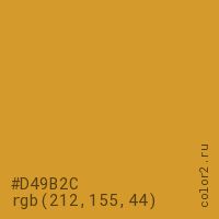 Цвет #D49B2C в цветовой модели RGB обозначается тремя октетами (212, 155, 44) в десятичном формате и #D49B2C в шестнадцатиричном (hex) формате, которые являются интенсивностью красного 212 (hex D4), интенсивность зелёного 155 (hex 9B) и интенсивность синего 44 (hex 2C).