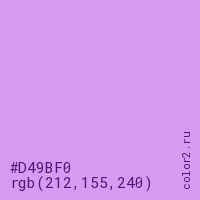 Цвет #D49BF0 в цветовой модели RGB обозначается тремя октетами (212, 155, 240) в десятичном формате и #D49BF0 в шестнадцатиричном (hex) формате, которые являются интенсивностью красного 212 (hex D4), интенсивность зелёного 155 (hex 9B) и интенсивность синего 240 (hex F0).