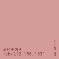 Цвет #D49C99 в цветовой модели RGB обозначается тремя октетами (212, 156, 153) в десятичном формате и #D49C99 в шестнадцатиричном (hex) формате, которые являются интенсивностью красного 212 (hex D4), интенсивность зелёного 156 (hex 9C) и интенсивность синего 153 (hex 99).