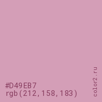 Цвет #D49EB7 в цветовой модели RGB обозначается тремя октетами (212, 158, 183) в десятичном формате и #D49EB7 в шестнадцатиричном (hex) формате, которые являются интенсивностью красного 212 (hex D4), интенсивность зелёного 158 (hex 9E) и интенсивность синего 183 (hex B7).
