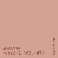Цвет #D4A293 в цветовой модели RGB обозначается тремя октетами (212, 162, 147) в десятичном формате и #D4A293 в шестнадцатиричном (hex) формате, которые являются интенсивностью красного 212 (hex D4), интенсивность зелёного 162 (hex A2) и интенсивность синего 147 (hex 93).