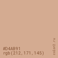 Цвет #D4AB91 в цветовой модели RGB обозначается тремя октетами (212, 171, 145) в десятичном формате и #D4AB91 в шестнадцатиричном (hex) формате, которые являются интенсивностью красного 212 (hex D4), интенсивность зелёного 171 (hex AB) и интенсивность синего 145 (hex 91).