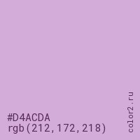 Цвет #D4ACDA в цветовой модели RGB обозначается тремя октетами (212, 172, 218) в десятичном формате и #D4ACDA в шестнадцатиричном (hex) формате, которые являются интенсивностью красного 212 (hex D4), интенсивность зелёного 172 (hex AC) и интенсивность синего 218 (hex DA).