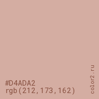Цвет #D4ADA2 в цветовой модели RGB обозначается тремя октетами (212, 173, 162) в десятичном формате и #D4ADA2 в шестнадцатиричном (hex) формате, которые являются интенсивностью красного 212 (hex D4), интенсивность зелёного 173 (hex AD) и интенсивность синего 162 (hex A2).
