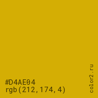 Цвет #D4AE04 в цветовой модели RGB обозначается тремя октетами (212, 174, 4) в десятичном формате и #D4AE04 в шестнадцатиричном (hex) формате, которые являются интенсивностью красного 212 (hex D4), интенсивность зелёного 174 (hex AE) и интенсивность синего 4 (hex 04).