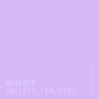 Цвет #D4B8F8 в цветовой модели RGB обозначается тремя октетами (212, 184, 248) в десятичном формате и #D4B8F8 в шестнадцатиричном (hex) формате, которые являются интенсивностью красного 212 (hex D4), интенсивность зелёного 184 (hex B8) и интенсивность синего 248 (hex F8).