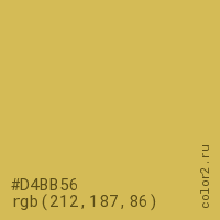 Цвет #D4BB56 в цветовой модели RGB обозначается тремя октетами (212, 187, 86) в десятичном формате и #D4BB56 в шестнадцатиричном (hex) формате, которые являются интенсивностью красного 212 (hex D4), интенсивность зелёного 187 (hex BB) и интенсивность синего 86 (hex 56).