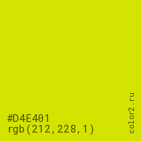 Цвет #D4E401 в цветовой модели RGB обозначается тремя октетами (212, 228, 1) в десятичном формате и #D4E401 в шестнадцатиричном (hex) формате, которые являются интенсивностью красного 212 (hex D4), интенсивность зелёного 228 (hex E4) и интенсивность синего 1 (hex 01).