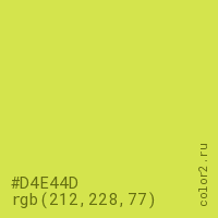 Цвет #D4E44D в цветовой модели RGB обозначается тремя октетами (212, 228, 77) в десятичном формате и #D4E44D в шестнадцатиричном (hex) формате, которые являются интенсивностью красного 212 (hex D4), интенсивность зелёного 228 (hex E4) и интенсивность синего 77 (hex 4D).