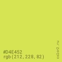 Цвет #D4E452 в цветовой модели RGB обозначается тремя октетами (212, 228, 82) в десятичном формате и #D4E452 в шестнадцатиричном (hex) формате, которые являются интенсивностью красного 212 (hex D4), интенсивность зелёного 228 (hex E4) и интенсивность синего 82 (hex 52).