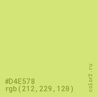 Цвет #D4E578 в цветовой модели RGB обозначается тремя октетами (212, 229, 120) в десятичном формате и #D4E578 в шестнадцатиричном (hex) формате, которые являются интенсивностью красного 212 (hex D4), интенсивность зелёного 229 (hex E5) и интенсивность синего 120 (hex 78).