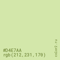 Цвет #D4E7AA в цветовой модели RGB обозначается тремя октетами (212, 231, 170) в десятичном формате и #D4E7AA в шестнадцатиричном (hex) формате, которые являются интенсивностью красного 212 (hex D4), интенсивность зелёного 231 (hex E7) и интенсивность синего 170 (hex AA).