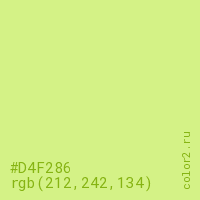 Цвет #D4F286 в цветовой модели RGB обозначается тремя октетами (212, 242, 134) в десятичном формате и #D4F286 в шестнадцатиричном (hex) формате, которые являются интенсивностью красного 212 (hex D4), интенсивность зелёного 242 (hex F2) и интенсивность синего 134 (hex 86).