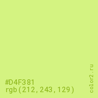 Цвет #D4F381 в цветовой модели RGB обозначается тремя октетами (212, 243, 129) в десятичном формате и #D4F381 в шестнадцатиричном (hex) формате, которые являются интенсивностью красного 212 (hex D4), интенсивность зелёного 243 (hex F3) и интенсивность синего 129 (hex 81).
