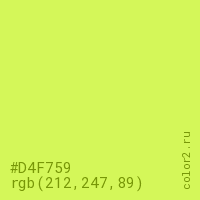 Цвет #D4F759 в цветовой модели RGB обозначается тремя октетами (212, 247, 89) в десятичном формате и #D4F759 в шестнадцатиричном (hex) формате, которые являются интенсивностью красного 212 (hex D4), интенсивность зелёного 247 (hex F7) и интенсивность синего 89 (hex 59).