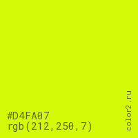 Цвет #D4FA07 в цветовой модели RGB обозначается тремя октетами (212, 250, 7) в десятичном формате и #D4FA07 в шестнадцатиричном (hex) формате, которые являются интенсивностью красного 212 (hex D4), интенсивность зелёного 250 (hex FA) и интенсивность синего 7 (hex 07).