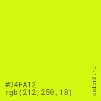 Цвет #D4FA12 в цветовой модели RGB обозначается тремя октетами (212, 250, 18) в десятичном формате и #D4FA12 в шестнадцатиричном (hex) формате, которые являются интенсивностью красного 212 (hex D4), интенсивность зелёного 250 (hex FA) и интенсивность синего 18 (hex 12).