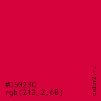Цвет #D5023C в цветовой модели RGB обозначается тремя октетами (213, 2, 60) в десятичном формате и #D5023C в шестнадцатиричном (hex) формате, которые являются интенсивностью красного 213 (hex D5), интенсивность зелёного 2 (hex 02) и интенсивность синего 60 (hex 3C).