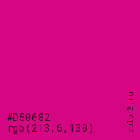 Цвет #D50682 в цветовой модели RGB обозначается тремя октетами (213, 6, 130) в десятичном формате и #D50682 в шестнадцатиричном (hex) формате, которые являются интенсивностью красного 213 (hex D5), интенсивность зелёного 6 (hex 06) и интенсивность синего 130 (hex 82).