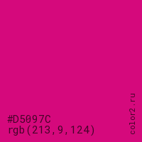 Цвет #D5097C в цветовой модели RGB обозначается тремя октетами (213, 9, 124) в десятичном формате и #D5097C в шестнадцатиричном (hex) формате, которые являются интенсивностью красного 213 (hex D5), интенсивность зелёного 9 (hex 09) и интенсивность синего 124 (hex 7C).