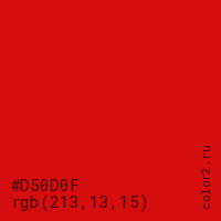Цвет #D50D0F в цветовой модели RGB обозначается тремя октетами (213, 13, 15) в десятичном формате и #D50D0F в шестнадцатиричном (hex) формате, которые являются интенсивностью красного 213 (hex D5), интенсивность зелёного 13 (hex 0D) и интенсивность синего 15 (hex 0F).