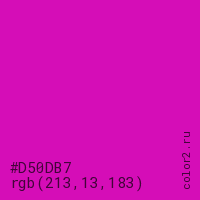 Цвет #D50DB7 в цветовой модели RGB обозначается тремя октетами (213, 13, 183) в десятичном формате и #D50DB7 в шестнадцатиричном (hex) формате, которые являются интенсивностью красного 213 (hex D5), интенсивность зелёного 13 (hex 0D) и интенсивность синего 183 (hex B7).