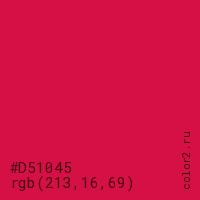 Цвет #D51045 в цветовой модели RGB обозначается тремя октетами (213, 16, 69) в десятичном формате и #D51045 в шестнадцатиричном (hex) формате, которые являются интенсивностью красного 213 (hex D5), интенсивность зелёного 16 (hex 10) и интенсивность синего 69 (hex 45).