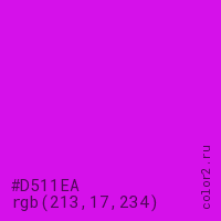 Цвет #D511EA в цветовой модели RGB обозначается тремя октетами (213, 17, 234) в десятичном формате и #D511EA в шестнадцатиричном (hex) формате, которые являются интенсивностью красного 213 (hex D5), интенсивность зелёного 17 (hex 11) и интенсивность синего 234 (hex EA).