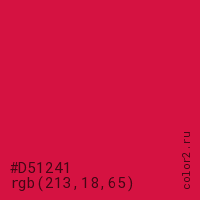 Цвет #D51241 в цветовой модели RGB обозначается тремя октетами (213, 18, 65) в десятичном формате и #D51241 в шестнадцатиричном (hex) формате, которые являются интенсивностью красного 213 (hex D5), интенсивность зелёного 18 (hex 12) и интенсивность синего 65 (hex 41).