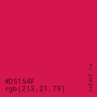 Цвет #D5154F в цветовой модели RGB обозначается тремя октетами (213, 21, 79) в десятичном формате и #D5154F в шестнадцатиричном (hex) формате, которые являются интенсивностью красного 213 (hex D5), интенсивность зелёного 21 (hex 15) и интенсивность синего 79 (hex 4F).