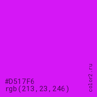 Цвет #D517F6 в цветовой модели RGB обозначается тремя октетами (213, 23, 246) в десятичном формате и #D517F6 в шестнадцатиричном (hex) формате, которые являются интенсивностью красного 213 (hex D5), интенсивность зелёного 23 (hex 17) и интенсивность синего 246 (hex F6).