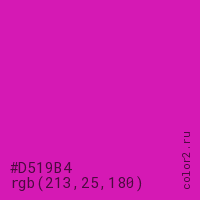 Цвет #D519B4 в цветовой модели RGB обозначается тремя октетами (213, 25, 180) в десятичном формате и #D519B4 в шестнадцатиричном (hex) формате, которые являются интенсивностью красного 213 (hex D5), интенсивность зелёного 25 (hex 19) и интенсивность синего 180 (hex B4).