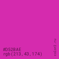 Цвет #D52BAE в цветовой модели RGB обозначается тремя октетами (213, 43, 174) в десятичном формате и #D52BAE в шестнадцатиричном (hex) формате, которые являются интенсивностью красного 213 (hex D5), интенсивность зелёного 43 (hex 2B) и интенсивность синего 174 (hex AE).