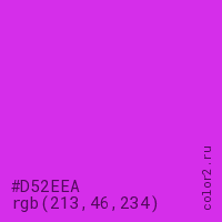 Цвет #D52EEA в цветовой модели RGB обозначается тремя октетами (213, 46, 234) в десятичном формате и #D52EEA в шестнадцатиричном (hex) формате, которые являются интенсивностью красного 213 (hex D5), интенсивность зелёного 46 (hex 2E) и интенсивность синего 234 (hex EA).