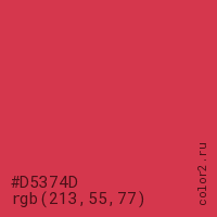 Цвет #D5374D в цветовой модели RGB обозначается тремя октетами (213, 55, 77) в десятичном формате и #D5374D в шестнадцатиричном (hex) формате, которые являются интенсивностью красного 213 (hex D5), интенсивность зелёного 55 (hex 37) и интенсивность синего 77 (hex 4D).