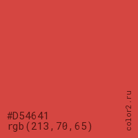 Цвет #D54641 в цветовой модели RGB обозначается тремя октетами (213, 70, 65) в десятичном формате и #D54641 в шестнадцатиричном (hex) формате, которые являются интенсивностью красного 213 (hex D5), интенсивность зелёного 70 (hex 46) и интенсивность синего 65 (hex 41).