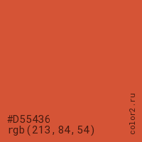 Цвет #D55436 в цветовой модели RGB обозначается тремя октетами (213, 84, 54) в десятичном формате и #D55436 в шестнадцатиричном (hex) формате, которые являются интенсивностью красного 213 (hex D5), интенсивность зелёного 84 (hex 54) и интенсивность синего 54 (hex 36).