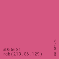 Цвет #D55681 в цветовой модели RGB обозначается тремя октетами (213, 86, 129) в десятичном формате и #D55681 в шестнадцатиричном (hex) формате, которые являются интенсивностью красного 213 (hex D5), интенсивность зелёного 86 (hex 56) и интенсивность синего 129 (hex 81).