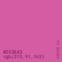 Цвет #D55BA3 в цветовой модели RGB обозначается тремя октетами (213, 91, 163) в десятичном формате и #D55BA3 в шестнадцатиричном (hex) формате, которые являются интенсивностью красного 213 (hex D5), интенсивность зелёного 91 (hex 5B) и интенсивность синего 163 (hex A3).
