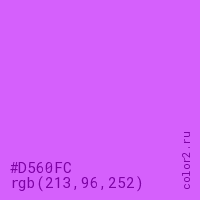 Цвет #D560FC в цветовой модели RGB обозначается тремя октетами (213, 96, 252) в десятичном формате и #D560FC в шестнадцатиричном (hex) формате, которые являются интенсивностью красного 213 (hex D5), интенсивность зелёного 96 (hex 60) и интенсивность синего 252 (hex FC).