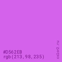 Цвет #D562EB в цветовой модели RGB обозначается тремя октетами (213, 98, 235) в десятичном формате и #D562EB в шестнадцатиричном (hex) формате, которые являются интенсивностью красного 213 (hex D5), интенсивность зелёного 98 (hex 62) и интенсивность синего 235 (hex EB).