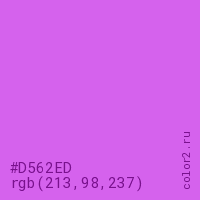 Цвет #D562ED в цветовой модели RGB обозначается тремя октетами (213, 98, 237) в десятичном формате и #D562ED в шестнадцатиричном (hex) формате, которые являются интенсивностью красного 213 (hex D5), интенсивность зелёного 98 (hex 62) и интенсивность синего 237 (hex ED).