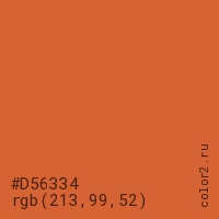Цвет #D56334 в цветовой модели RGB обозначается тремя октетами (213, 99, 52) в десятичном формате и #D56334 в шестнадцатиричном (hex) формате, которые являются интенсивностью красного 213 (hex D5), интенсивность зелёного 99 (hex 63) и интенсивность синего 52 (hex 34).