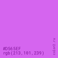 Цвет #D565EF в цветовой модели RGB обозначается тремя октетами (213, 101, 239) в десятичном формате и #D565EF в шестнадцатиричном (hex) формате, которые являются интенсивностью красного 213 (hex D5), интенсивность зелёного 101 (hex 65) и интенсивность синего 239 (hex EF).