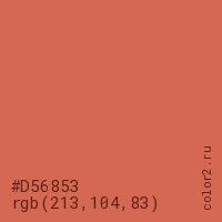 Цвет #D56853 в цветовой модели RGB обозначается тремя октетами (213, 104, 83) в десятичном формате и #D56853 в шестнадцатиричном (hex) формате, которые являются интенсивностью красного 213 (hex D5), интенсивность зелёного 104 (hex 68) и интенсивность синего 83 (hex 53).