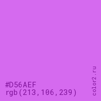 Цвет #D56AEF в цветовой модели RGB обозначается тремя октетами (213, 106, 239) в десятичном формате и #D56AEF в шестнадцатиричном (hex) формате, которые являются интенсивностью красного 213 (hex D5), интенсивность зелёного 106 (hex 6A) и интенсивность синего 239 (hex EF).