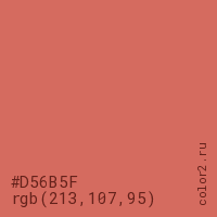 Цвет #D56B5F в цветовой модели RGB обозначается тремя октетами (213, 107, 95) в десятичном формате и #D56B5F в шестнадцатиричном (hex) формате, которые являются интенсивностью красного 213 (hex D5), интенсивность зелёного 107 (hex 6B) и интенсивность синего 95 (hex 5F).
