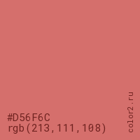 Цвет #D56F6C в цветовой модели RGB обозначается тремя октетами (213, 111, 108) в десятичном формате и #D56F6C в шестнадцатиричном (hex) формате, которые являются интенсивностью красного 213 (hex D5), интенсивность зелёного 111 (hex 6F) и интенсивность синего 108 (hex 6C).