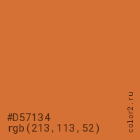 Цвет #D57134 в цветовой модели RGB обозначается тремя октетами (213, 113, 52) в десятичном формате и #D57134 в шестнадцатиричном (hex) формате, которые являются интенсивностью красного 213 (hex D5), интенсивность зелёного 113 (hex 71) и интенсивность синего 52 (hex 34).